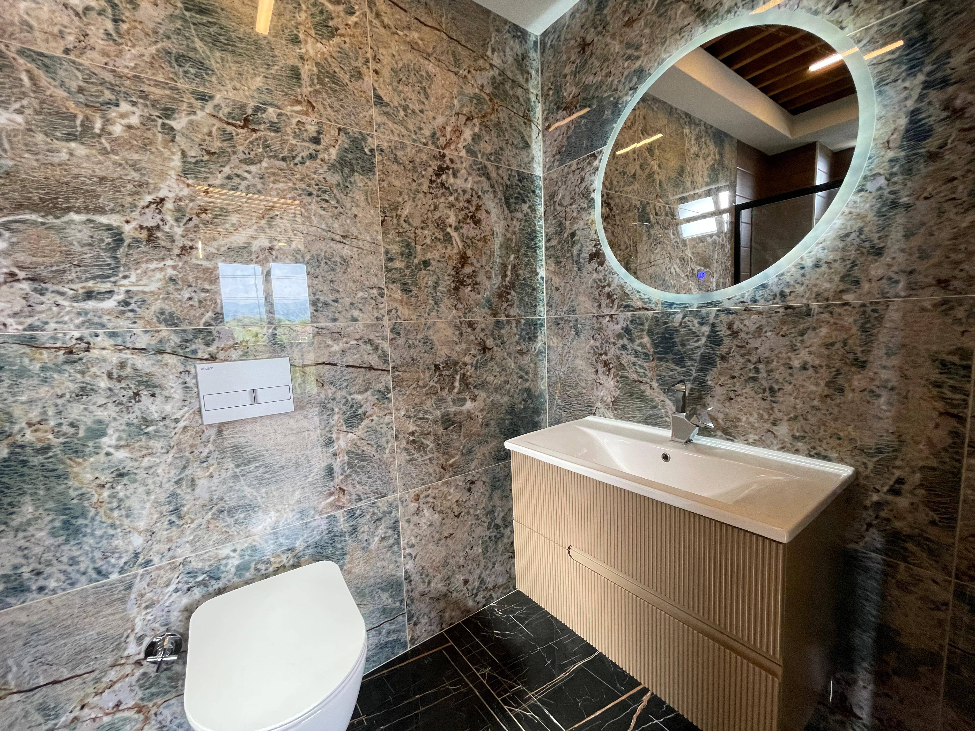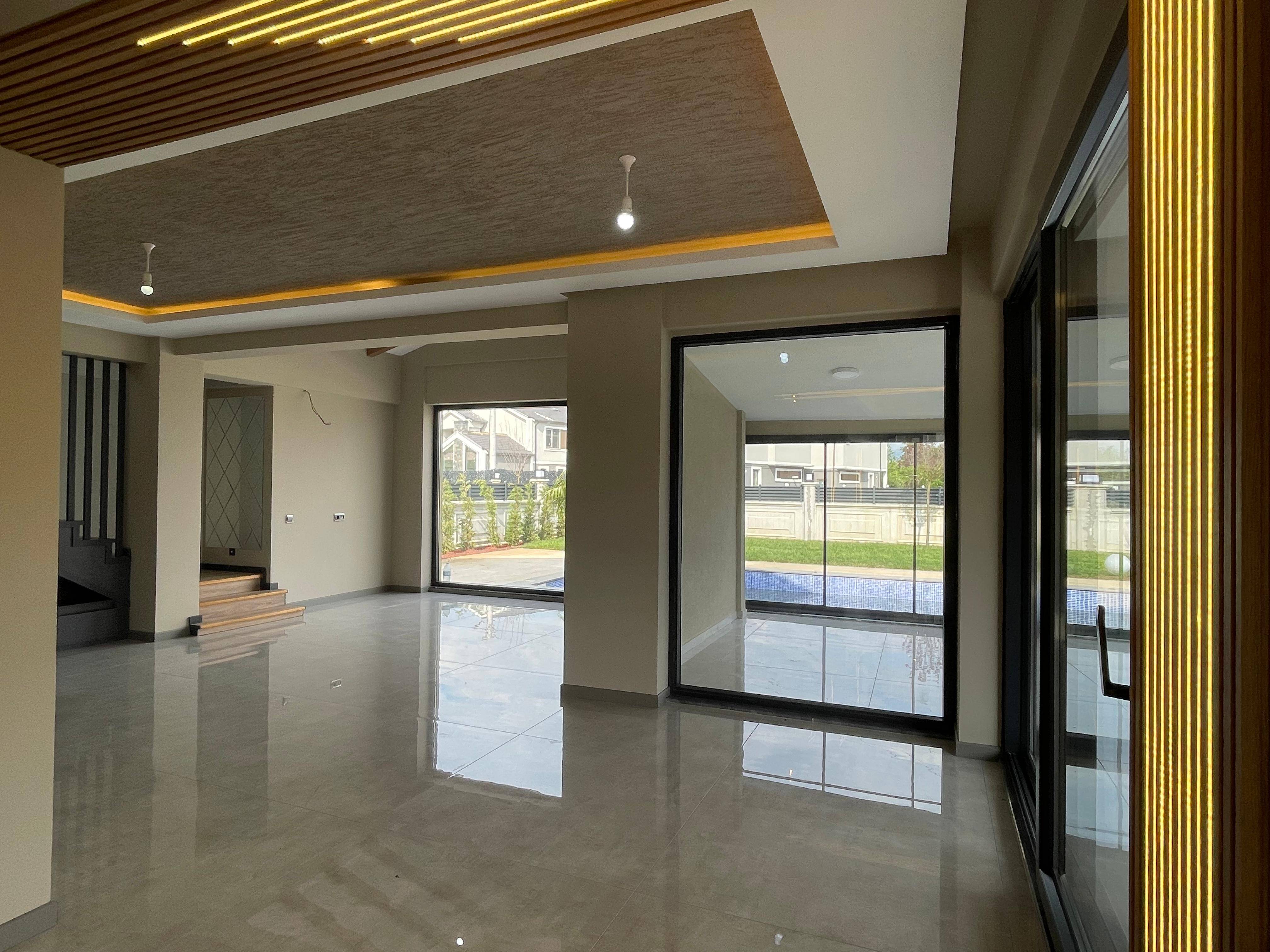 VİLLANIN MODERN MİMARİSİNE UYGUN SEÇİLMİŞ SERAMİK ZEMİNLER VARDIR